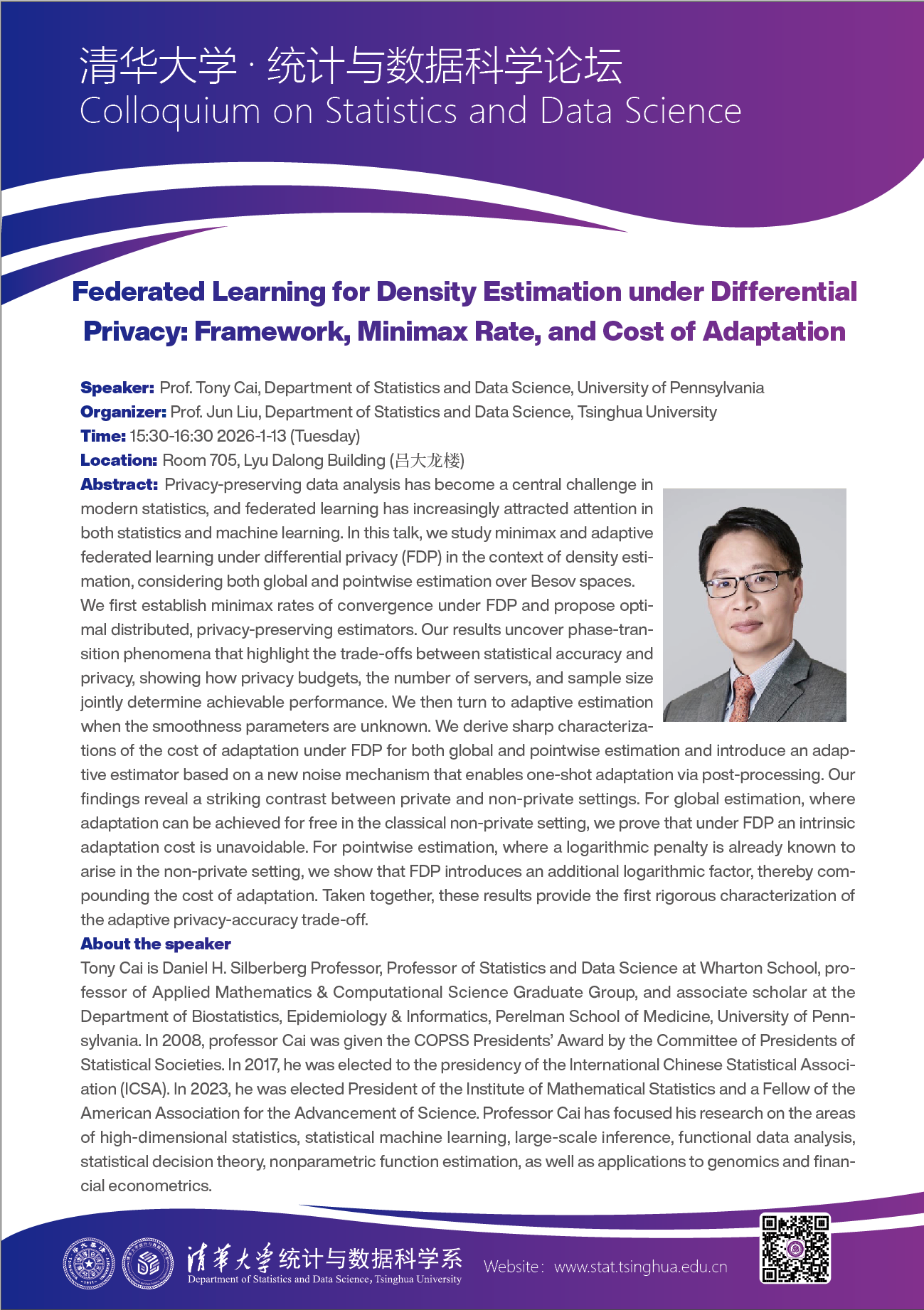 【统计与数据科学论坛】Federated Learning for Density Estimation under Differential Privacy: Framework, Minimax Rate, and Cost of Adaptation