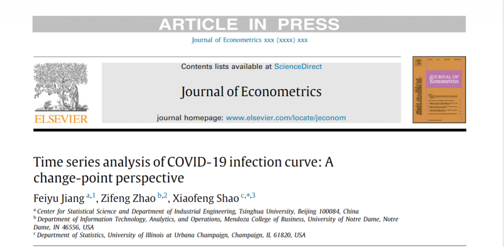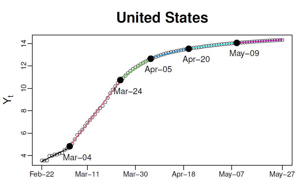 近日,我中心2016级博士生蒋斐宇以第一作者的身份撰写的论文“Time series analysis of COVID-19 infection curve: A change-point perspective”被计量经济学国际顶尖期刊Journal of Econometrics接收并在线发表。该论文是蒋斐宇在美国伊利诺伊大学厄巴纳香槟分校(UIUC)统计系访问期间,与其在UIUC的合作导师邵晓峰教授以及圣母大学的赵子锋助理教授合作完成的。新冠病毒(COVID-19)的累计确诊人数或累计死亡人数通常在病毒爆发初期快速增长,而后因为政府的各种干预政策增长率逐渐平缓直至为零。因此,在一段较短的时间内,可以假设累计确诊人数(死亡人数)的增长率是平稳不变的。利用此假设,该论文用分段线性趋势的半参数模型对全球30个国家感染新冠病毒的累计确诊人数和累计死亡人数进行建模。分段线性趋势模型首先使用自正则化(self-normalization)的方法将累计确诊人数(死亡人数)的对数曲线进行断点检测,依据这些增长率发生变化的断点再将曲线分割为多条平稳的线段,从而在每一条线段内,累计确诊人数(死亡人数)的增长率保持不变。下图为美国累计确诊人数的例子,该文将美国累计确诊人数的对数曲线近似地分割为六条线段,在每条线段内斜率(即增长率)保持不变。