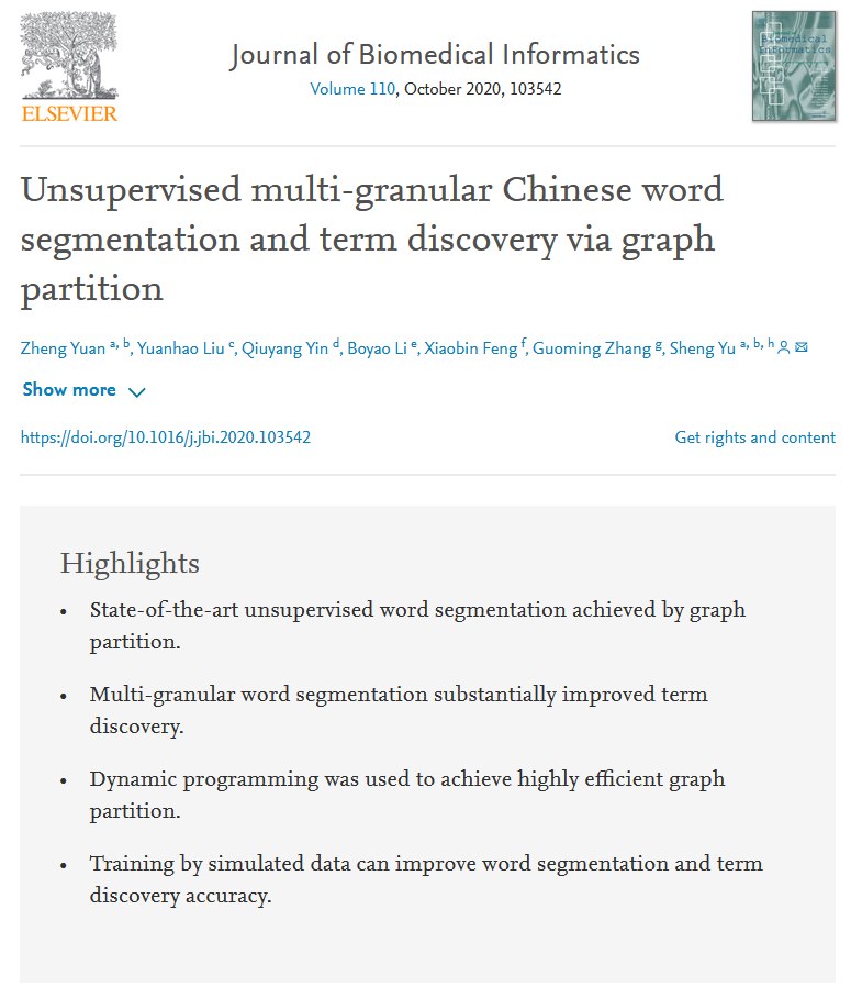 近日,我中心2017级博士研究生袁正以第一作者身份撰写的论文 “Unsupervised multi-granular Chinese word segmentation and term discovery via graph partition” 被Journal of Biomedical Informatics (Health Informatics Q1,Computer Science Applications Q1) 接收并在线发表。该论文是作者同91热爆