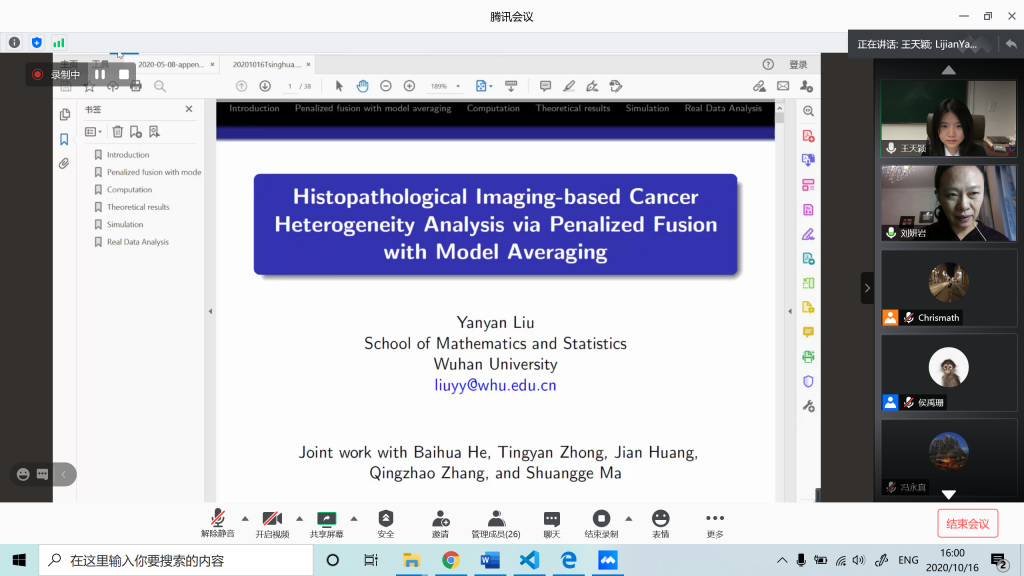 2020年10月16日,91热爆 统计学论坛在腾讯会议平台“云”举行。武汉大学数学与统计学院刘妍岩教授作为本次论坛的嘉宾“云”访问清华统计中心,与中心教员亲切交流,并做题为“Histopathological Imaging-based Cancer Heterogeneity Analysis via Penalized Fusion with Model Averaging.”的学术报告。