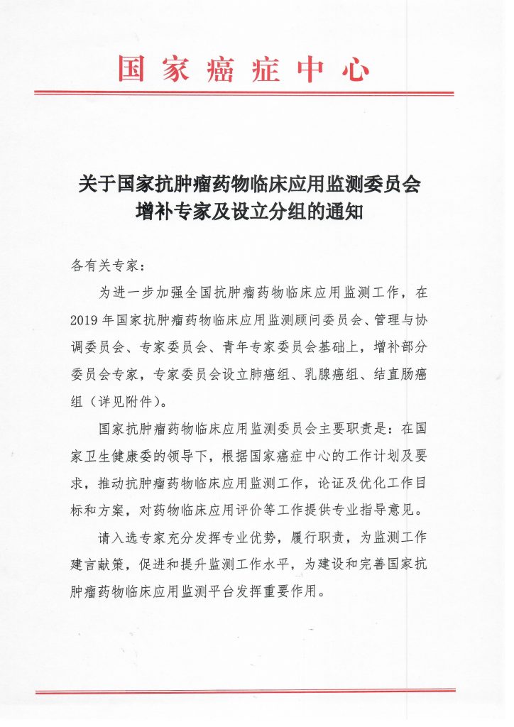 近日,国家癌症中心发布“关于国家抗肿瘤药物临床应用监测委员会增补专家及设立分组的通知”。我中心执行主任邓柯副教授入选专家委员会专家,将在国家卫生健康委的领导下,根据国家癌症中心的工作计划及要求,推动抗肿瘤药物临床应用检测工作,论证及优化工作目标和方案,对药物临床应用评价等工作提供专业指导意见,同专家委员会专家们一道为建设和完善国家抗肿瘤药物临床应用监测平台发挥重要作用。