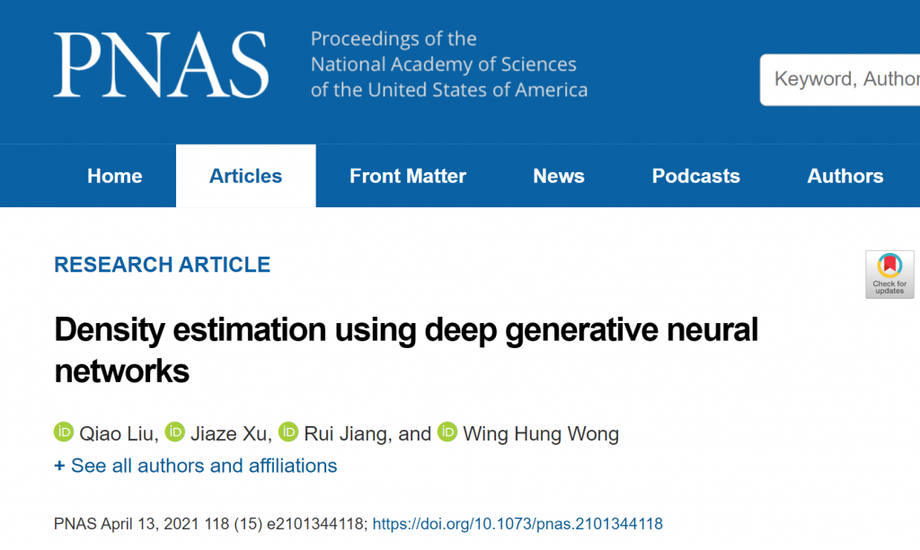 自动化系江瑞教授团队、斯坦福大学统计系Wing Hung Wong教授团队的合作文章“Density estimation using deep generative neural networks”在《美国科学院院刊》(PNAS)在线发表。徐嘉泽同学于2020年1月赴美国斯坦福大学进行为期近一年的访问学习,在访问期间主要参与了Wing Hung Wong教授实验室的文本分析、贝叶斯蒙特卡洛算法开发等方面的工作。在本项目中,徐嘉泽同学参与了模型构建和工具开发等工作。
